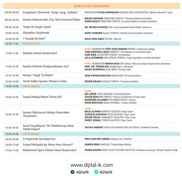 Moderatörlüğünü ve açılış konuşmasını Yrd. Doç. Dr. Fatoş Karahasan’ın üstleneceği Dijital İK Konferansı’na konuşmacı olarak katılacak diğer isimler şöyle: Vodafone Türkiye Yetenek Geliştirme Direktörü Bülent Bayram, Vodafone Türkiye Kurumsal İlişkiler ve İletişim Direktörü Gizem Keçeci, TEB İnsan Kaynakları Genel Müdür Yardımcısı Doç. Dr. Nilsen Altıntaş, PepsiCo Türkiye Kıdemli İnsan Kaynakları Direktörü Katey Howard, TEVİTÖL öğrencisi Halil Utku Ünlü, Markafoni İK Grup Direktörü Seda Kayrak Kızıltan, Google Türkiye Pazarlama Müdürü Özgür Kirazcı, Flow Uluslararası Koçluk Okulu Akademik Direktörü Talya Vardar, isteoyun.com Direktörü Niels Van Der Linden, Linkedin Türkiye Bölge Müdürü Serden Eren, Great Place to Work Institute Almanya, Avusturya, Türkiye Yönetici Ortağı Frank Hauser.