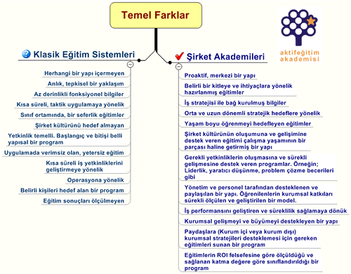 Geleneksel eğitim çalışmaları ile Şirket Akademileri arasında önemli farklılıklar bulunmaktadır. Temel farklardan birisi; şirket Akademileri eğitimlerinin şirketin stratejik planları dikkate alınarak tasarlanmasıdır. Temel farklar aşağıdaki tabloda özetlenmiştir.