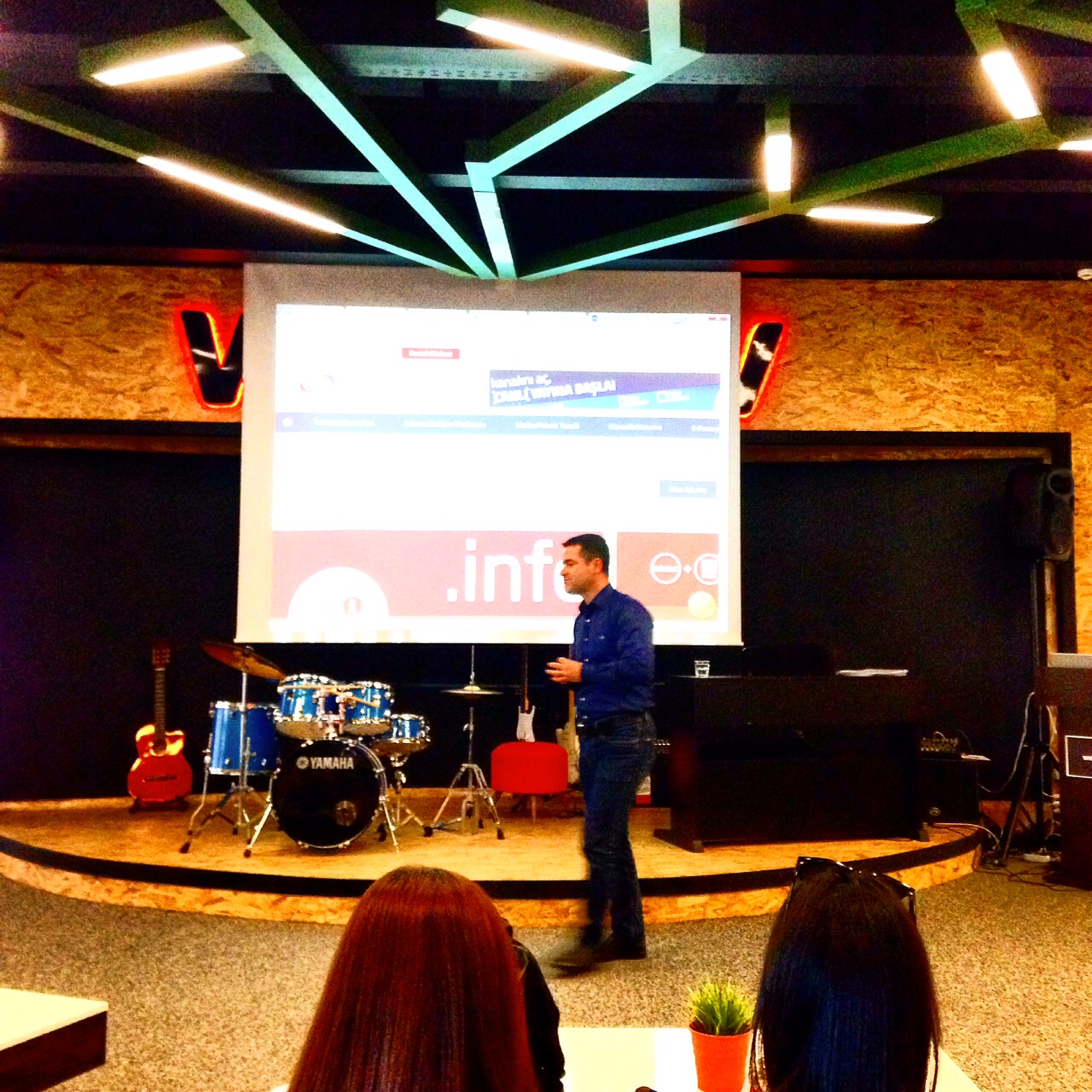 Burası alt katta, bahsettiğim renkli koltukların olduğu alan. web.tv yazısının altında bateri, gitar ve piyano var. Normalde koltuklar, ayrı ayrı oturma grupları olacak şekilde düzenleniyor. Gerektiğinde sahne olarak kullanılabiliyor, bu fotoğraftaki sahne düzeni versiyonu.