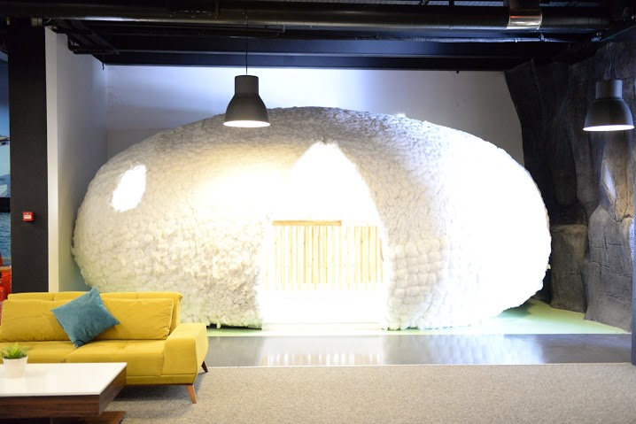 Konseptli çalışma odaları arasında en beğendiğim bu oldu. Hayır bu bir iglo değil. İpek Kozası şeklinde bir ofis. Bembeyaz pamuklar, ses yalıtımı da sağlıyormuş, içine girince fark ediyorsunuz nasıl da izole bir ortam olduğunu. Ben olsam kaçar kaçar burada çalışırdım…
