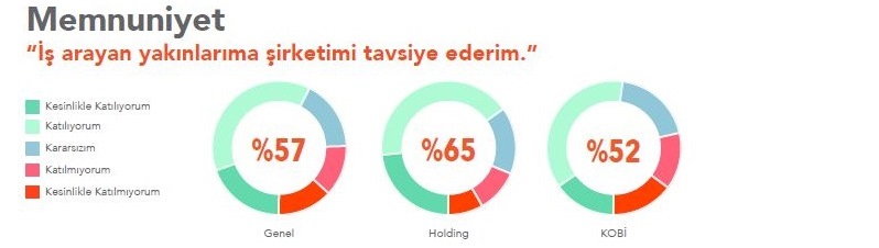 Memnuniyetle ilgili “İş arayan yakınlarıma şirketimi tavsiye ederim” görüşüne araştırmaya katılan profesyonellerin %19’unun “Kesinlikle Katıldığı”, %38’inin “Katıldığı”, %17’sinin “Kararsız” kaldığı, %12’sinin “Katılmadığı”, “%14’ünün ise “Kesinlikle Katılmadığı” sonucu ve uç noktalardaki “kesinlikle” ifadesine şirketle olan özdeşleşme ya da şirkete karşı duyulan olumsuz tepkinin dışa vurumu olarak yorumlandığı bilgisi önemli bir sonucu gösteriyor.