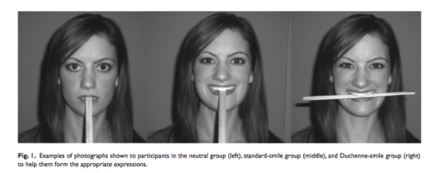 Psikolog Fritz Strack’ın yaptığı deneysel çalışma gülümsemenin etkileri konusunda öncüdür. Bu çalışmada deneklere ruh haline yönelik test sorularını çözerken ağızlarında bir kalemi geniş bir şekilde tutmalarını söylendi.