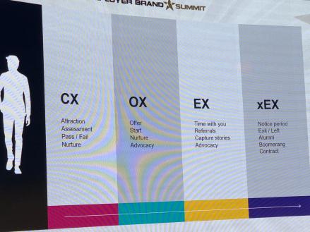 Deneyim yolculuğunu CX (Aday Deneyimi) -> OX (İşe Giriş Deneyimi) -> EX (Çalışan Deneyimi) -> x EX (Eski Çalışan Deneyimi) olarak sıralıyor. “Data size ne olduğunu söyler ama insan bunun neden olduğunu söyler” diyerek dijitalleşen süreçlere rağmen en önemli faktörün her zaman insan olacağını hatırlattı.