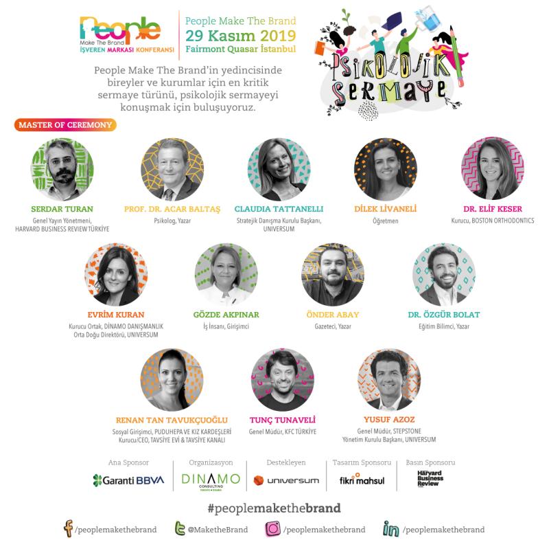 Markayı inşa edenin insan olduğu fikriyle, işi insan olan her sektörden profesyonele, akademisyene, araştırmacıya, girişimciye ilham vermeye devam eden ve Harvard Business Review Türkiye Genel Yayın Yönetmeni Serdar Turan’ın Master of Ceremony olacağı ve Dinamo Danışmanlık Kurucu Ortağı ve Universum Orta Doğu Direktörü Evrim Kuran’ın açılışını yapacağı konferansın bu yılki teması “Psikolojik Sermaye”. Psikolojik sermayenin; umut, özyeterlilik, yılmazlık, iyimserlik bileşenleriyle, bireyler ve kurumlar için ne kadar önemli olduğuna değinilecek konferansın bu yılki konuşmacıları, Profesör Dr. Acar Baltaş, Universum Yönetim Kurulu Başkanı ve Stepstone Genel Müdürü Yusuf Azoz, KFC Türkiye Genel Müdürü Tunç Tunaveli, Boston Orthodontics Kurucusu Dr. Elif Keser, İş İnsanı ve Girişimci Gözde Akpınar, Dilek Livaneli, Eğitim Bilimci ve Yazar Dr. Özgür Bolat, , Tavsiye Evi ve Tavsiye Kanalı Kurucusu Renan Tan Tavukçuoğlu, Gazeteci ve Yazar Önder Abay, Universum Stratejik Danışma Kurulu Başkanı Claudia Tattanelli olacak.