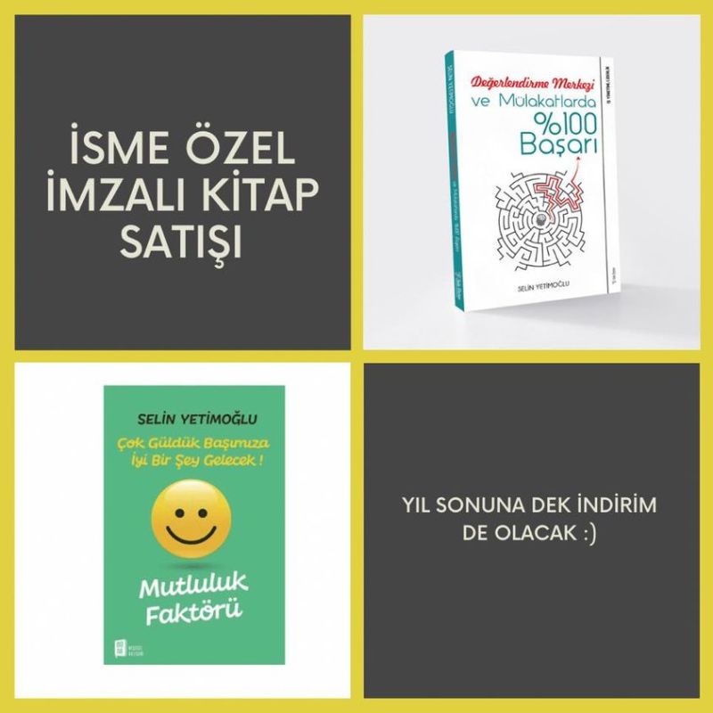 İkinci kitabım ne yazık ki tam bir “pandemi bebeği” olduğu için bu imkanı bulamadık. İsme özel imza atmayı ben de özledim. Bu nedenle geçici süreli bir isme özel imzalı kitap satışı düzenledik. Mutluluk Faktörü veya Değerlendirme Merkezi ve Mülakatlarda %100 Başarı kitaplarımı sipariş verenlerin istediği isme özel imzalayarak gönderimini gerçekleştiriyoruz. Yılbaşına dek ekstra bir indirim kampanyası da planladık.